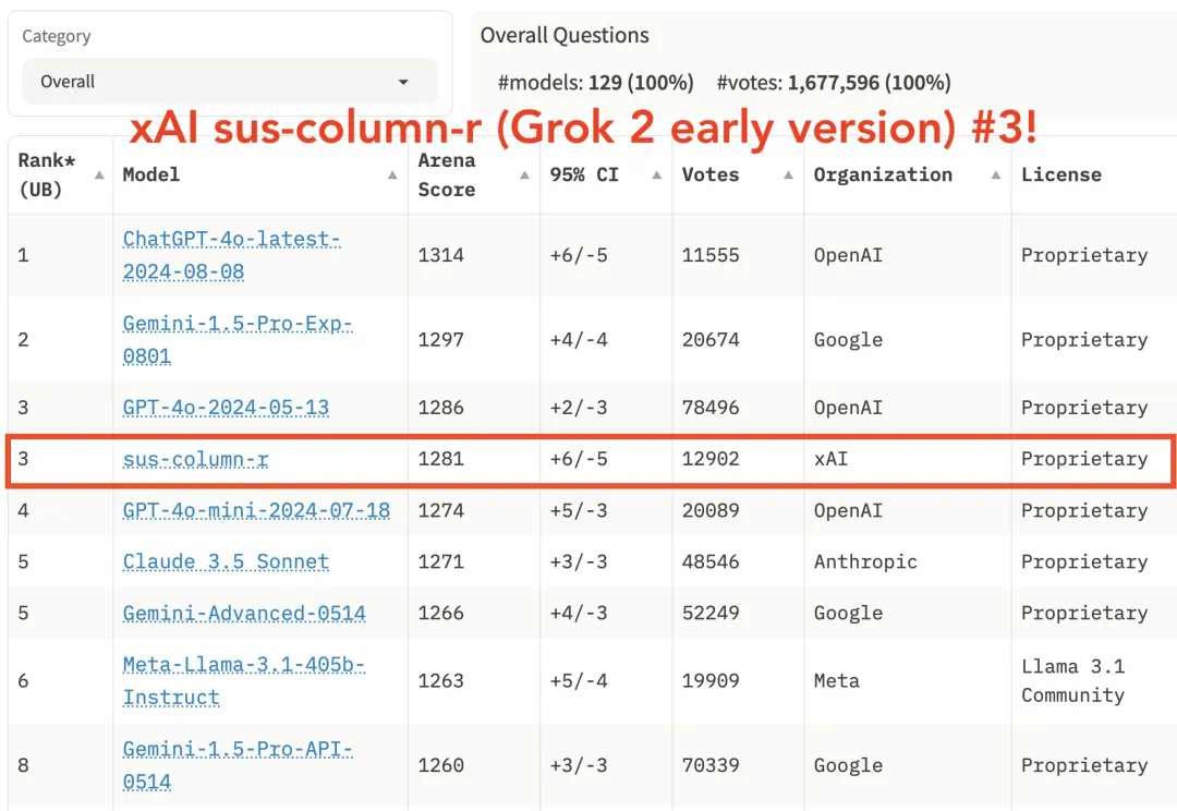 随着 xAI 将 Grok-2 的早期版本「sus-column-r」放入到 Chatbot Arena,我们看到了它与其他流行开闭源模型的性能比较。