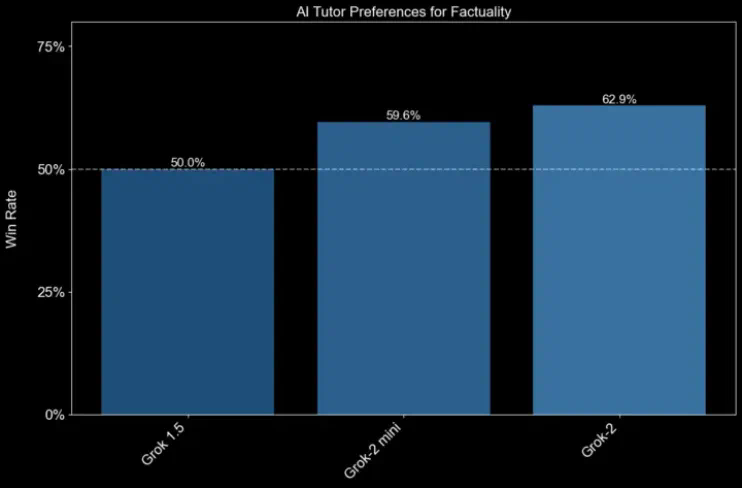 下图为 Grok 1.5 与 Grok 2 两个版本基于事实性的胜率比较。