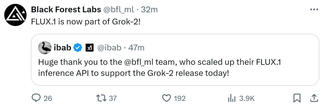 展开合作,试验他们的 FLUX.1 模型,以扩展 Grok 在 X 上的功能。