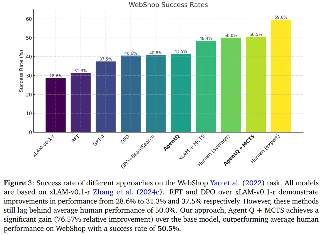 研究者进一步根据下图中概述的算法对基础模型进行了微调,结果比基础 DPO 模型提高了 0.9%。在精心训练的 Agent Q 模型上再应用 MCTS,智能体的性能提升到了 50.5%,略微超过了人类的平均表现。