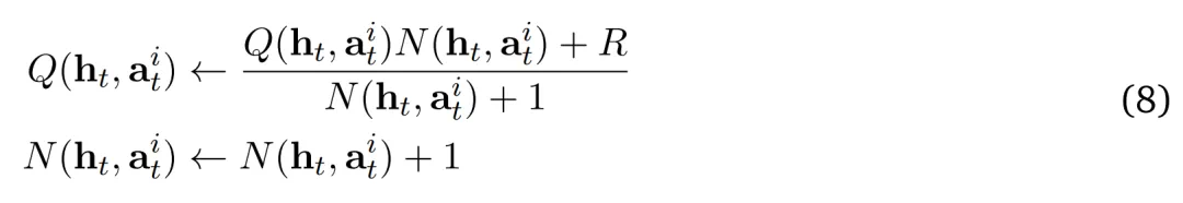 扩展和回溯。研究者在浏览器环境中选择并执行一个操作以到达一个新节点(页面)。从选定的状态节点轨迹开始,他们使用当前策略 𝜋_𝜃 展开轨迹,直到到达终止状态。环境在轨迹结束时返回奖励 𝑅,其中如果智能体成功则 𝑅 = 1,否则 𝑅 = 0。接下来,通过从叶节点到根节点自下而上地更新每个节点的值来反向传播此奖励,如下所示: