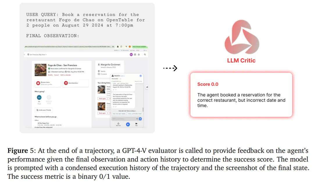 不过由于 OpenTable 是一个实时环境,很难通过编程或自动化的方式进行测量和评估。因此,研究者使用 GPT-4-V 根据以下指标为每个轨迹收集奖励:(1) 日期和时间设置正确,(2) 聚会规模设置正确,(3) 用户信息输入正确,以及 (4) 点击完成预订。如果满足上述所有条件,则视为智能体完成了任务。结果监督设置如下图 5 所示。