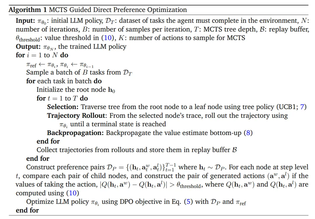 :该算法通过从 MCTS 生成的数据构建偏好对以微调模型。这种离策略训练方法允许模型从聚合数据集(包括搜索过程中探索的次优分支)中有效地学习,从而提高复杂环境中的成功率。