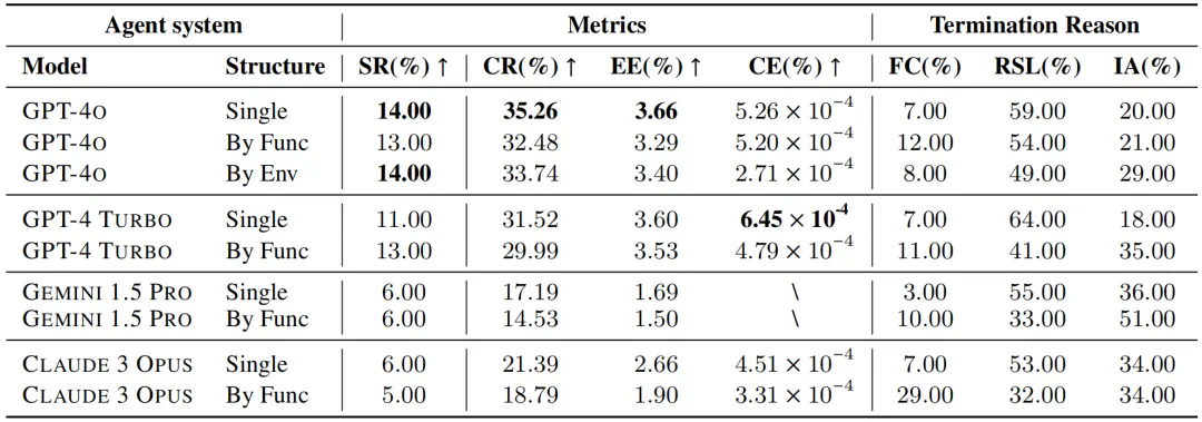 作者选取了当前较为流行的四个多模态模型进行了初步实验,实验结果表明,使用 GPT-4o 作为推理引擎的单智能体结构拥有最高的测试点完成率 35.26%。