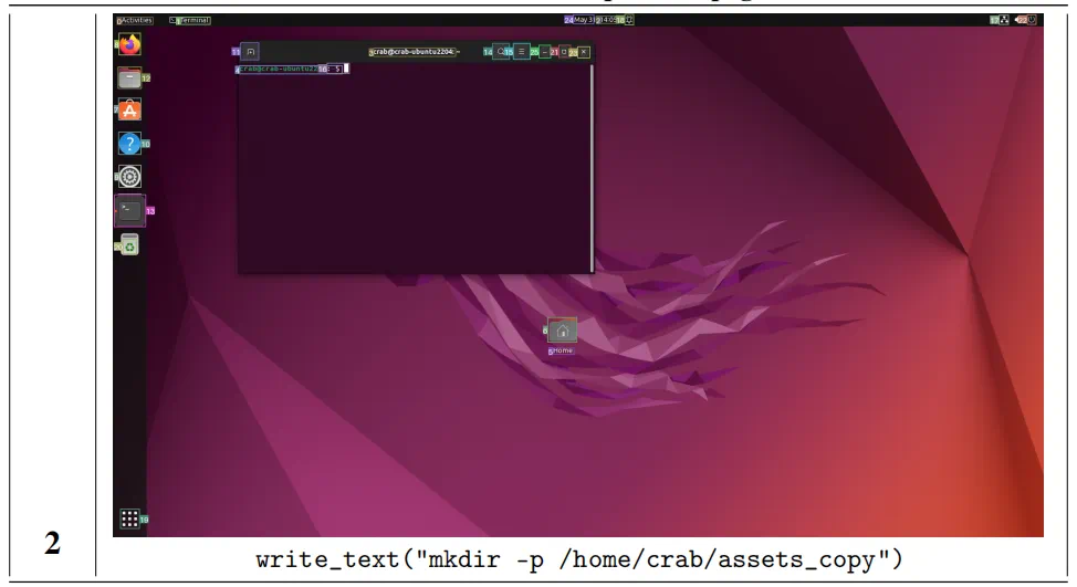 我们以一个具体任务举例,例如在 Ubuntu 系统上完成如下任务:创建一个新目录 “/home/crab/assets_copy”,并将所有具有指定 “txt” 扩展名的文件从 “/home/crab/assets” 复制到目录 “/home/crab/assets_copy”。