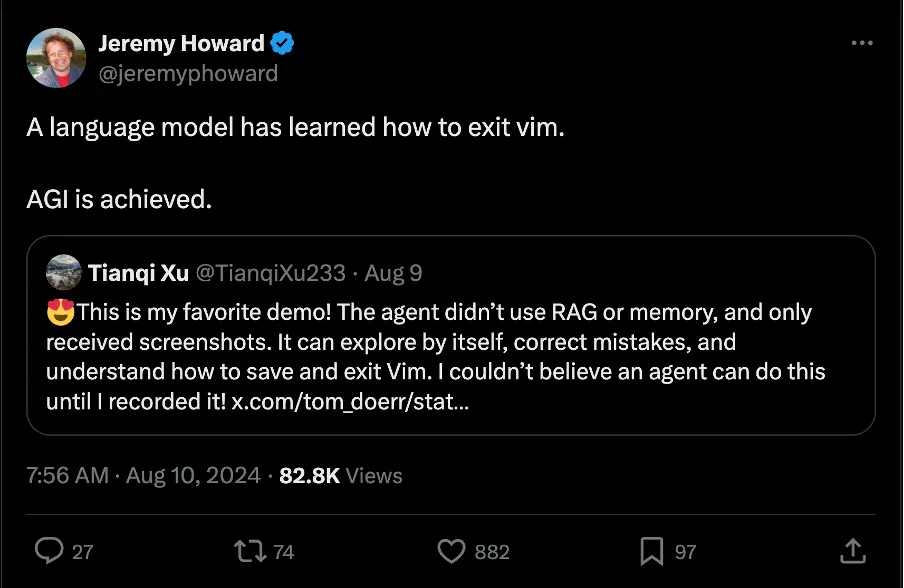 有人表示,AGI 已经达成,因为有大语言模型(指 CRAB)已经学会了如何退出 Vim。