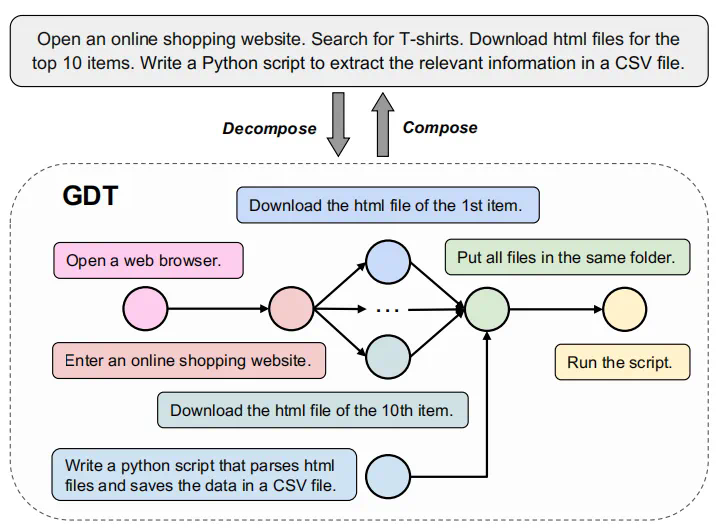 和动作历史 H 时,在环境 m 中采取动作 a 的概率。图任务分解(Graph of Decomposed Tasks, GDT)