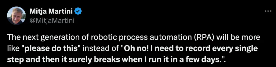 也有网友总结说下个下一代机器人流程自动化(RPA)将更像是 “请帮我完成下列任务”,而不需要记录每一个步骤,然后在几天内运行时崩溃。