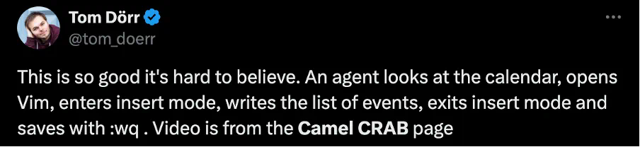 有人说很难相信一个智能体可以完成 “查看日历,打开 Vim,进入插入模式,输入事件列表,退出插入模式,并使用 :wq 保存” 这一系列任务。