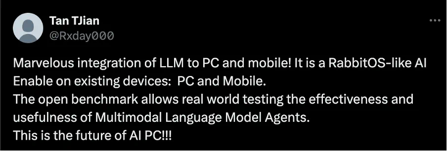 甚至有人夸赞道 CRAB 是 AI PC 的未来,认为这是 LLM 与 PC 和移动设备的完美结合,“它是一种类似 RabbitOS 的 AI,使现有的 PC 和移动设备具备 AI 功能。CRAB 的基准测试允许在现实世界中测试多模态语言模型代理的有效性和实用性。”