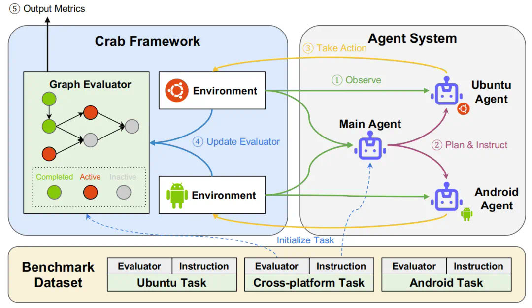 在 CRAB 框架中使用基于环境分工的多智能体系统的运行流程如上图所示。工作流程通过一个循环进行,首先通过主智能体观察环境,并对子智能体指定计划,然后所有的子智能体在各自的环境中执行操作。随后由一个图评估器(Graph Evaluator)来监视环境中各个子任务的状态,并在整个工作流程中不断更新任务的完成情况。这种评估方式可以贴近真实场景,以考验智能体的推理能力,这要求智能体能够处理复杂的消息传递,并且需要深入理解现实世界的情况。