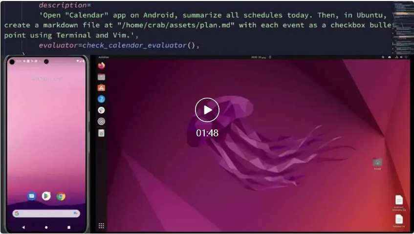 作为全新的智能体评估基准框架,CRAB(Cross-environment Agent Benchmark)主要用于评估基于多模态语言模型(MLMs)的智能体在跨环境任务中的表现。CRAB 可以模拟真实世界中人类用户同时使用多个设备完成复杂任务的场景,如 Demo 所示,CRAB 可以用来评估智能体同时操纵一个 Ubuntu 桌面系统和一个 Android 手机系统完成发送信息的过程。