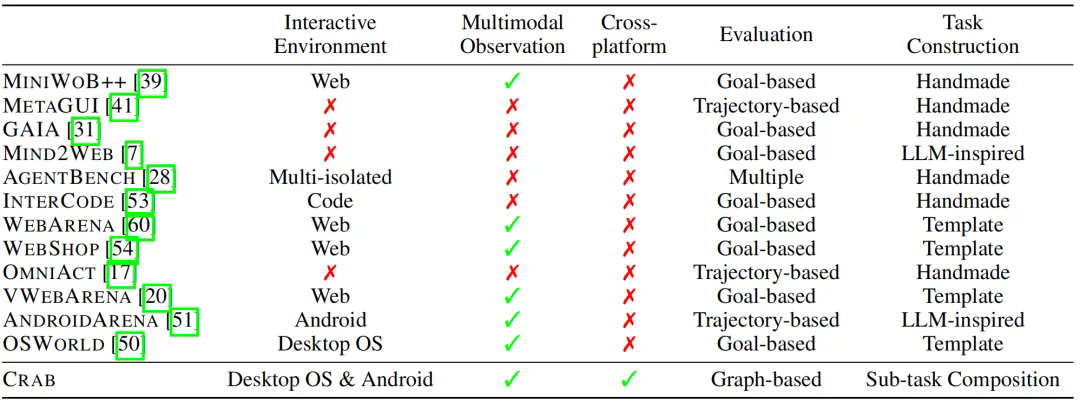 上表展示了本文提出的 CRAB 框架与现有其他智能体基准框架的对比,相比其他基准,CRAB 可以同时支持电脑和手机等跨平台的操作环境,可以模拟更加真实的使用场景。