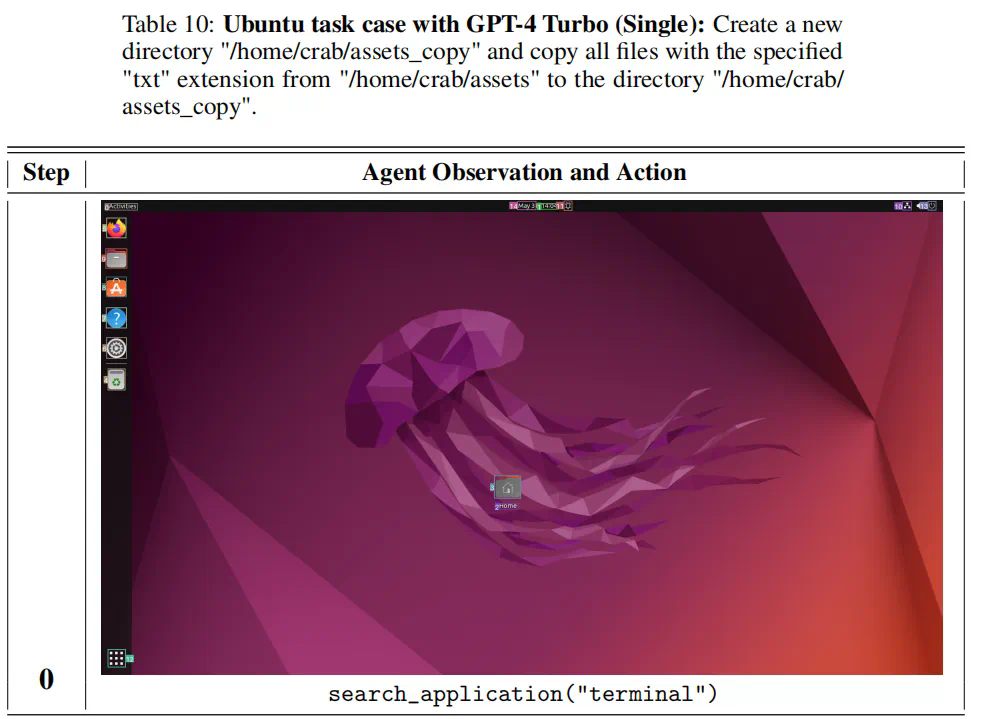 该任务需要执行多步操作才能完成,下图展示了当使用 GPT-4 Turbo 作为推理模型并采用单智能体结构时的实验细节。智能体首先使用 search_application 命令查找终端并打开。