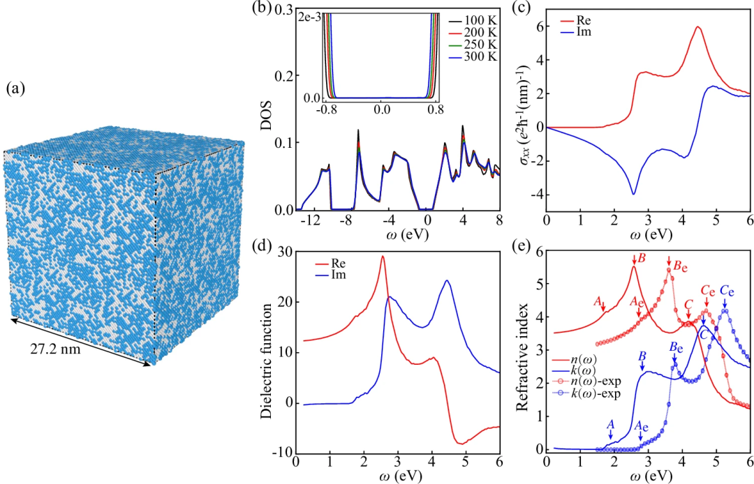 首先基于 DP 深度势能进行 DeePMD 分子动力学模拟有限温的结构采样,然后基于得到的采样构型,利用 DeePTB 进行紧束缚模型哈密顿量的构建,并基于预测的 TB 模型使用 TBPLaS 软件实现的 TB propagation method (TBPM) 方法进行无需对角化的快速的电子性质计算,得到包括有限温下的态密度(DOS)、光电导率、介电函数以及复折射率等电子性质及光电相应,如下图所示。