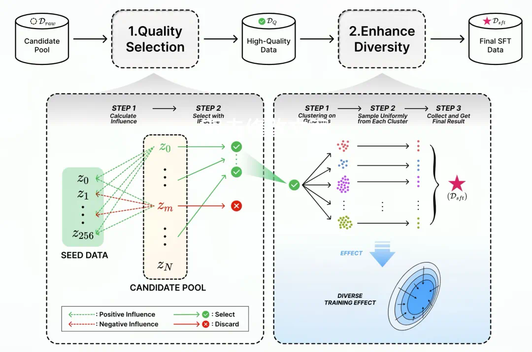 具体来说,我们借助影响函数和一个小型高质量种子数据集,选择对模型产生有益影响的训练示例作为高质量示例。此外,为了增强训练数据的多样性,我们通过对它们的梯度进行聚类和重新采样,最大程度地增加它们对模型影响的多样性。在 WMT22 和 FLORES 翻译任务上的大量实验证明了我们方法的优越性,深入的分析进一步验证了其有效性和通用性。