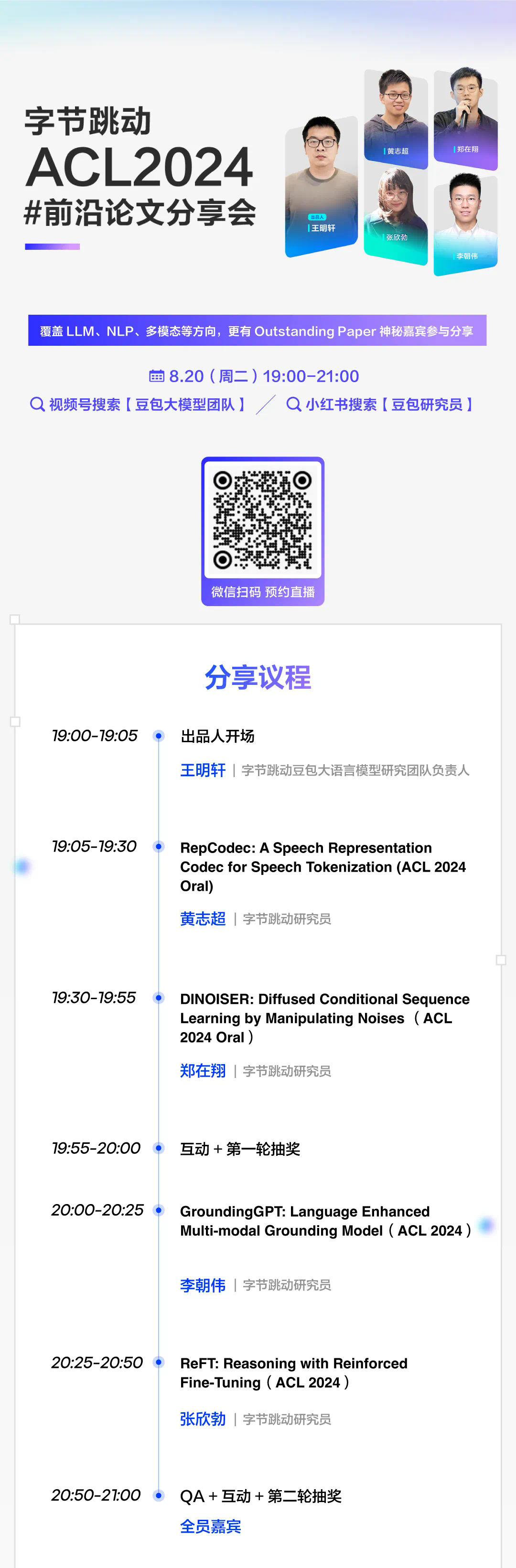 豆包大语言模型研究团队负责人王明轩,将携手字节跳动多位研究员黄志超、郑在翔、李朝伟、张欣勃、及 Outstanding Paper 神秘嘉宾,分享 ACL 部分精彩中选成果,研究方向涉及自然语言处理、语音处理、多模态学习、大模型推理等领域,欢迎预约!
