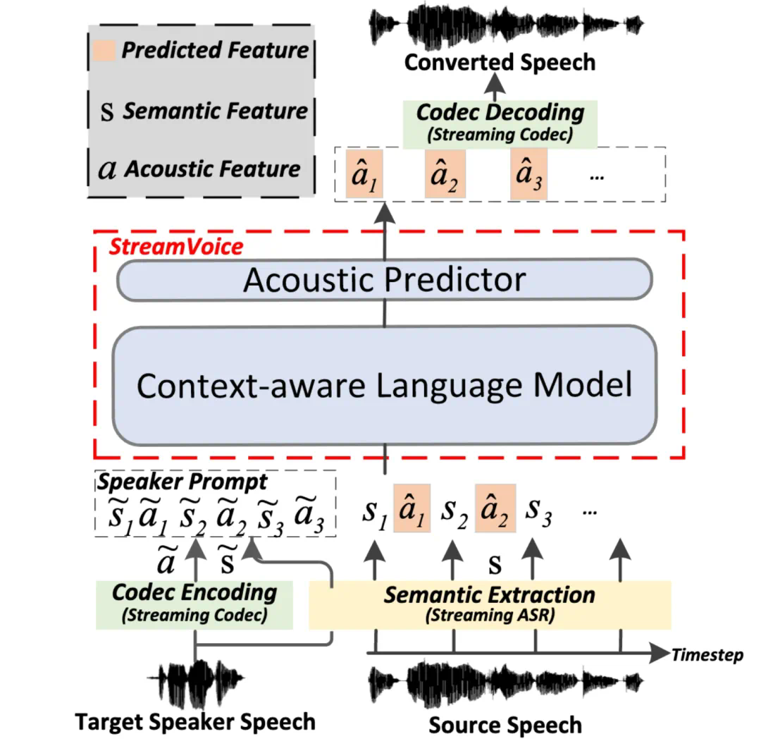 The overall architecture for StreamVoice在该工作中,我们提出 StreamVoice,一个新的基于流式 LM 的零样本语音转换模型,实现针对任意说话人和输入语音的实时转换。具体来说,为了实现流式能力,StreamVoice 使用上下文感知的完全因果 LM 以及时序无关的声学预测器,同时自回归过程中交替处理语义和声学特征消除了对完整源语音的依赖。