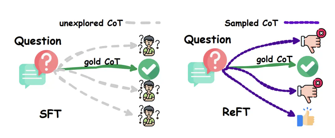 一种常见的增强大型语言模型(LLMs)推理能力的方法是使用思维链(CoT)标注数据进行有监督微调(SFT)。然而,这种方法并没有表现出足够强的泛化能力,因为训练仅依赖于给定的 CoT 数据。具体地,在数学问题的相关数据集中,训练数据中每个问题通常只有一条标注的推理路径。对于算法来说,如果能针对一个问题学习到多种标注的推理路径,会有更强的泛化能力。