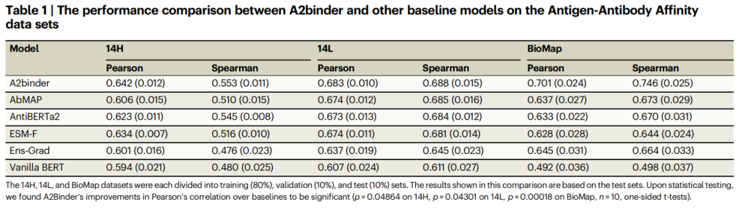 研究人员还开发了用于评估抗体-抗原亲和力的 A2binder。A2binder 能够实现准确且可推广的亲和力预测,即使对于未知抗原也是如此。