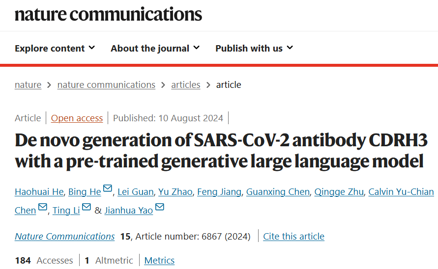 相关研究以「De novo generation of SARS-CoV-2 antibody CDRH3 with a pre-trained generative large language model」为题,于 8 月 10 日发布在《Nature Communications》上。
