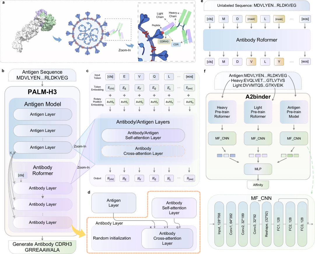 PALM-H3 的目的是生成抗体中的从头 CDRH3 序列。CDRH3 区域在决定抗体对特定抗原序列的结合特异性方面起着最重要的作用。PALM-H3 是一个类似 transformer 的模型,它使用基于 ESM2 的抗原模型作为编码器,使用抗体 Roformer 作为解码器。研究还构建了 A2binder 来预测人工生成的抗体的结合亲和力。