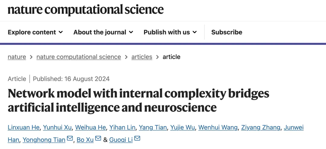 本篇工作发表在《Nature Computational Science》上,共同通讯作者是中国科学院自动化所李国齐研究员、徐波研究员,北京大学田永鸿教授。共同一作是清华大学钱学森班的本科生何林轩(自动化所实习生)、数理基科班本科生徐蕴辉(自动化所实习生),清华大学精仪系博士生何炜华和林逸晗。