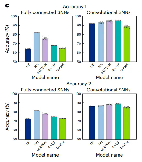 多任务学习实验:研究者通过使用 Fashion-MNIST 数据集进行多任务学习实验,结果表明 HH 网络模型能够与更大规模的 s-LIF2HH 网络模型实现相当性能,甚至略优于更大规模的一般 LIF 网络(图 3)。
