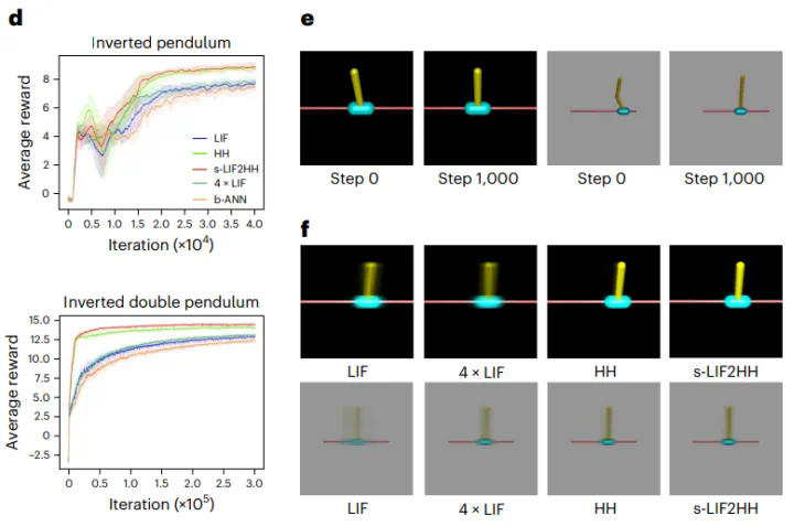 时序强化学习实验:研究者在倒立摆(Inverted Pendulum)和倒立双摆(Inverted Double Pendulum)环境下进行时序强化学习实验,结果表明 HH 网络模型能够与更大规模的 LIF 网络模型相比,表现出更强的时序信息提取能力(图 4)。