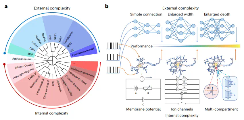人工智能与神经科学长期以来相互依存,协同发展。为了克服 “基于外生复杂性” 实现通用智能的困境,中国科学院自动化研究所李国齐、徐波研究团队联合清华大学、北京大学等借鉴大脑神经元复杂动力学特性,提出了 “基于内生复杂性” 的类脑神经元模型构建方法 (图 1),改善了传统模型通过向外拓展规模带来的计算资源消耗问题,为有效利用神经科学发展人工智能提供了示例。Nature Computational Science 期刊对此评论道:“AI 研究更加贴近工程与应用,而神经科学的研究更加具有探索性。研究团队挑战了这一传统观点,并表明更详细且生物学上更真实的神经元模型可以推动深度学习取得更大进展。”