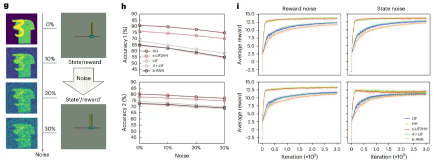 鲁棒性实验:研究者在多任务学习和深度强化学习任务中添加高斯噪声,以评估网络的鲁棒性。实验结果显示,更大规模的一般 LIF 网络模型在噪声影响下性能下降幅度最大,而 HH 网络模型和更大规模的 s-LIF2HH 网络模型则表现出更强的鲁棒性。在噪声强度增加的情况下,HH 网络模型和 s-LIF2HH 网络模型的奖励曲线仍然保持接近,并且相比一般 LIF 网络模型受到的影响显著地更小(图 5)。