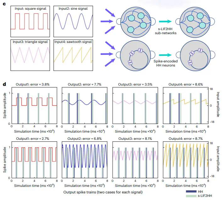 研究团队通过模拟神经元刺激输入对比网络输出对该理论进行了仿真验证。在相同的输入刺激下,具有更高外生复杂性的 tv-LIF 网络能够与 HH 模型产生相同的输出响应。进一步,团队将由四个 tv-LIF 神经元构建的 “HH 模型”(tv-LIF2HH)简化为 s-LIF2HH 模型,通过仿真实验验证了这种简化模型依然保有捕捉 HH 模型动力学行为的可能性 (图 2)。