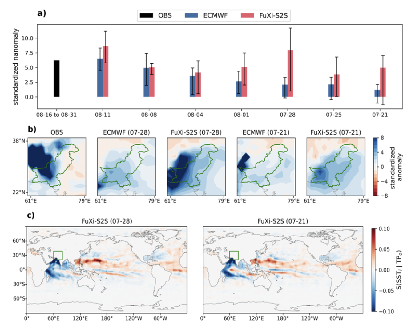 此外,「伏羲」次季节气候预测大模型还可以通过构建显著图 (Saliency map) 识别导致极端事件发生的潜在信息,这一能力在预测 2022 年巴基斯坦洪水期间的极端降雨方面得到了验证。