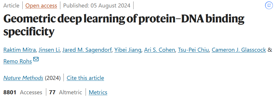 该研究以「Geometric deep learning of protein–DNA binding specificity」为题,于 2024 年 8 月 5 日发布在《Nature Methods》。