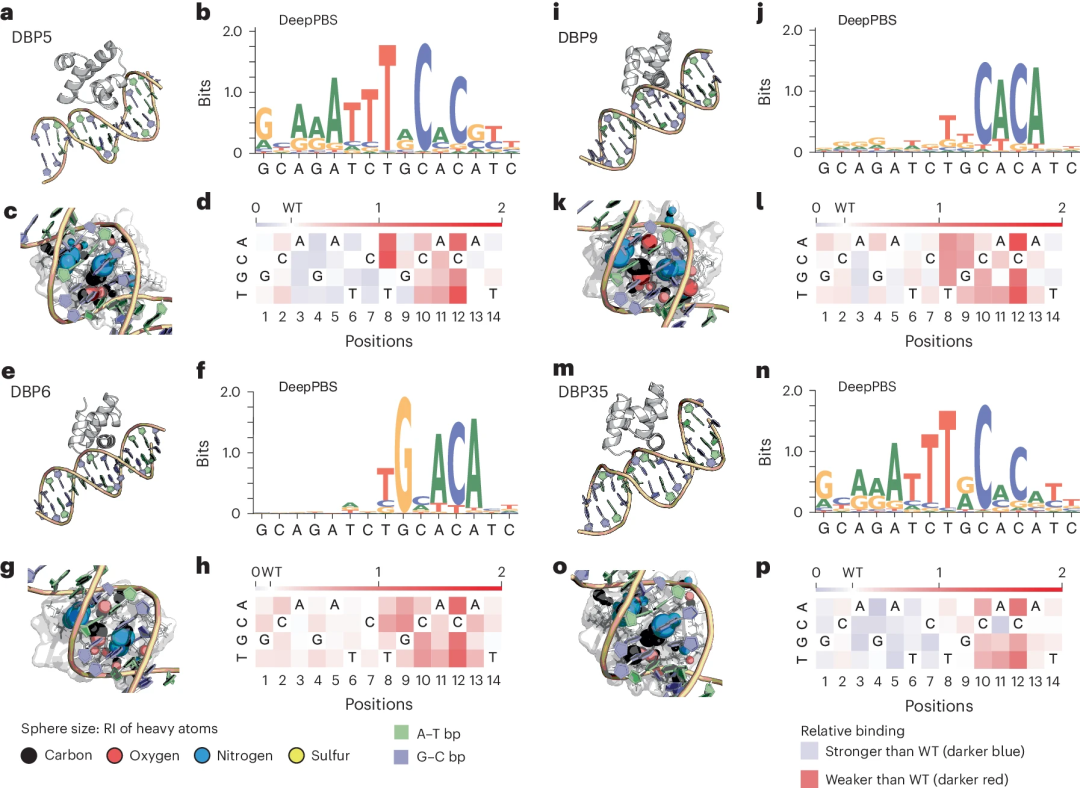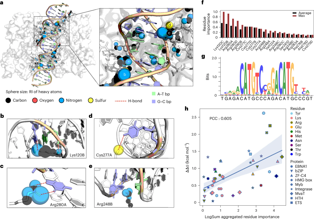 在可解释性方面,可以从 DeepPBS 中提取与 DNA 相互作用的蛋白质中不同重原子的「相对重要性」(RI)分数。