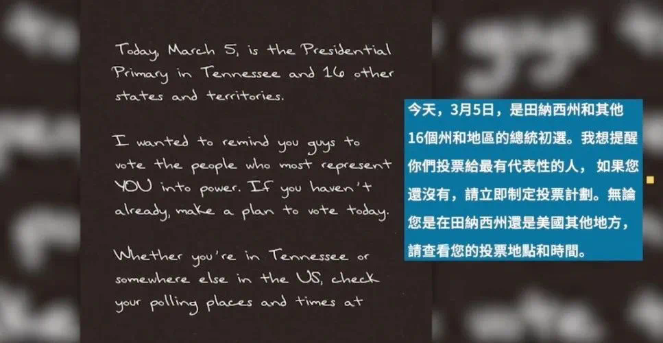 而在今年 3 月 5 日,美国大选「超级星期二」党内初选当天,她又通过社交平台 Instagram 号召关注者参与大选投票。