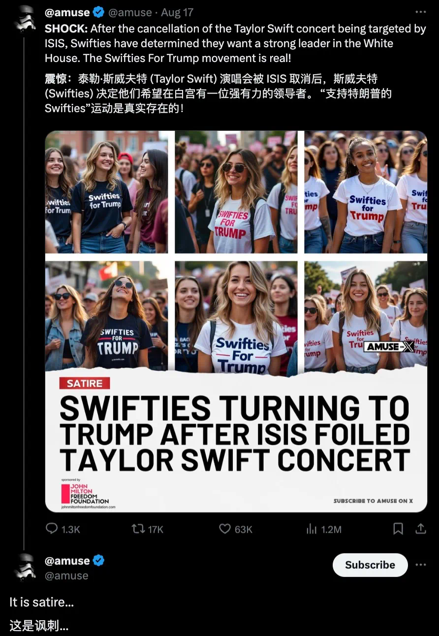 在发布关于霉霉粉丝支持特朗普的帖子之后,该账户又发布了一个后续帖子,称其内容为「纯属讽刺……」。