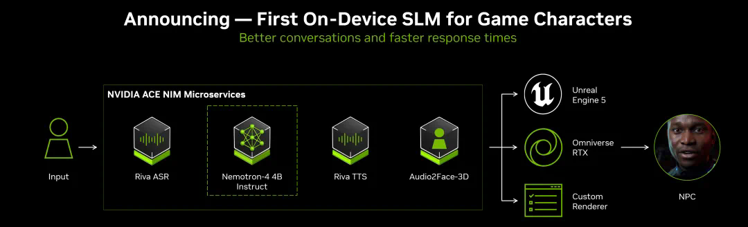 英伟达也在持续更新 ACE 的能力,今年提出的生产级微服务(Production Microservices)允许游戏、工具和应用程序开发人员将 AI 大模型能力无缝集成到数字人或游戏 NPC 中,构建出下一代游戏和应用的体验。