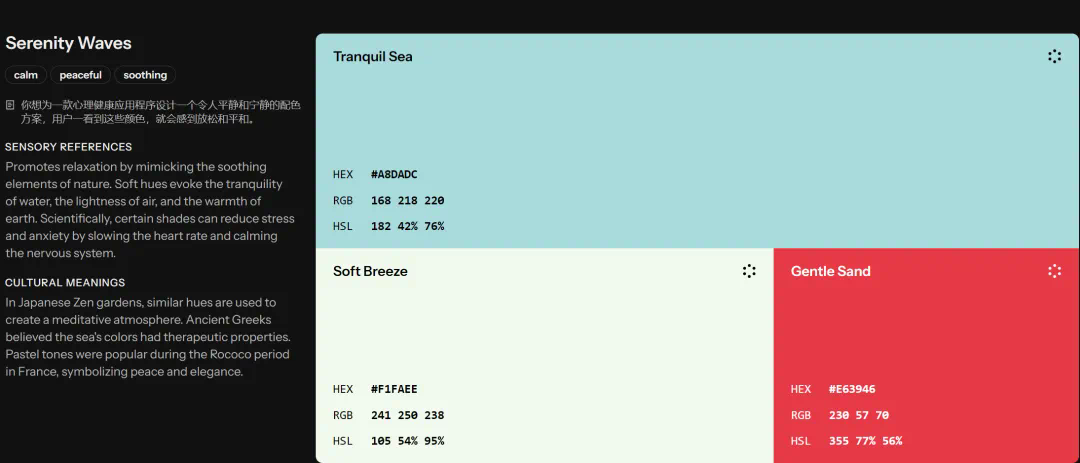 一个叫 「Sensory reference」,是指「感官参照」或「感觉参考」,解释了为什么这些配色对心理健康应用程序特别有效,让我们对 AI 生成的方案有一个更清楚的理解。