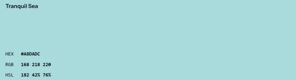 HEX: #A8DADC,亦即 A8 = 红色, DA = 绿色, DC = 蓝色。