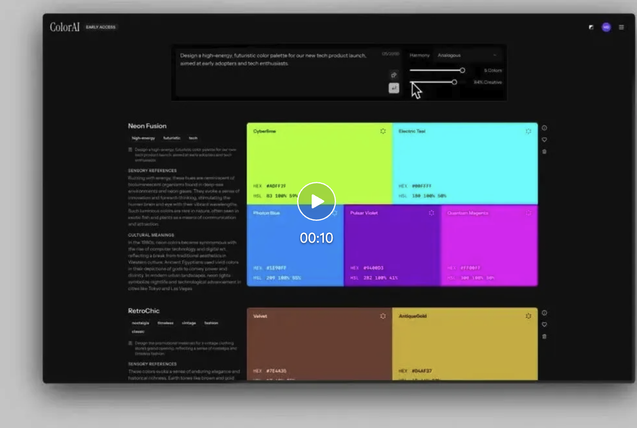 这个很小众的 AIGC 应用 ColorAI ,是一个调色板生成器,只要写出自己的创意和设计理念,它就能自动生成配色。
