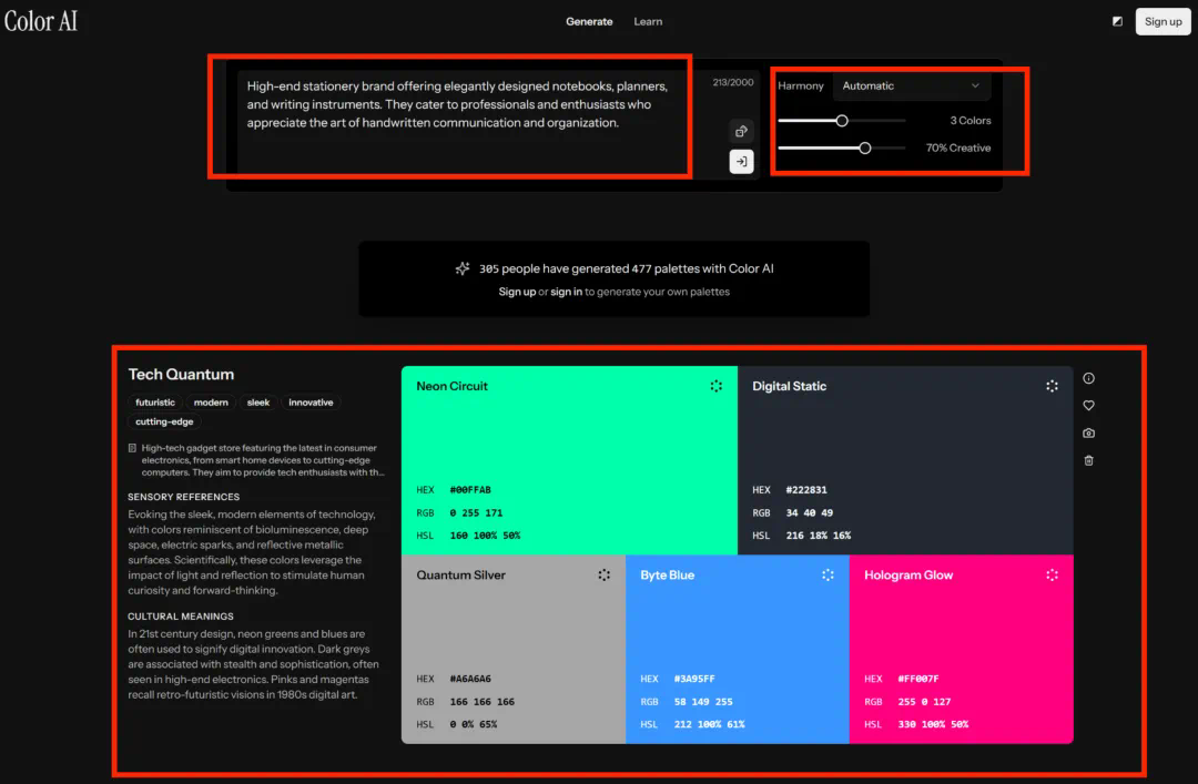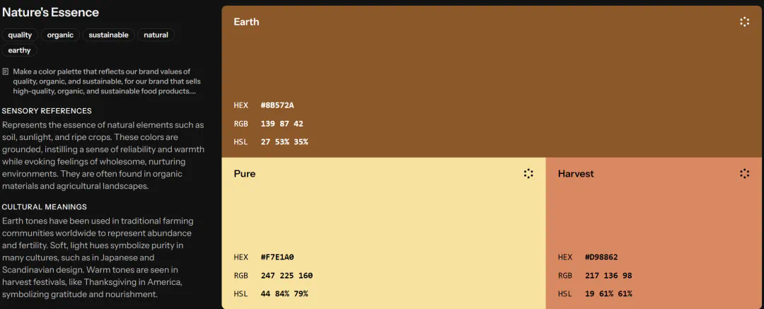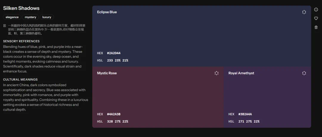 这个 ColorAI 和一般设计类 AI 有点不同,它会解释为什么这些颜色非常适合你的创意。