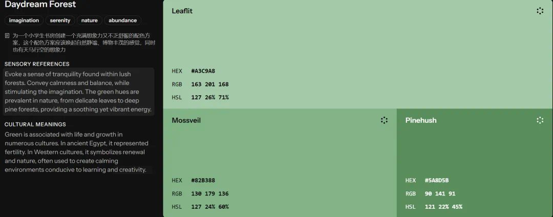 「为一个小学生书房创建一个充满想象力又不乏舒服的配色方案,这个配色方案应该唤起自然静谧、博物丰茂的感觉,同时也有天马行空的想象力。」