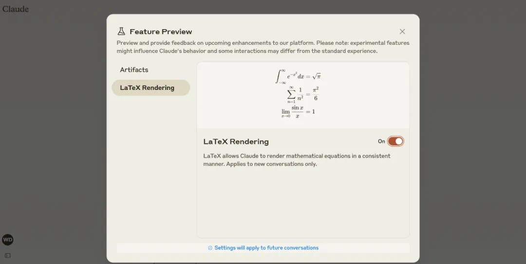 或许是听到了这些人的心声,今天 Claude(3.5 Sonnet)终于添加了 LaTeX 渲染功能预览,从而能够以一致的格式显示数学方程式和表达式。
