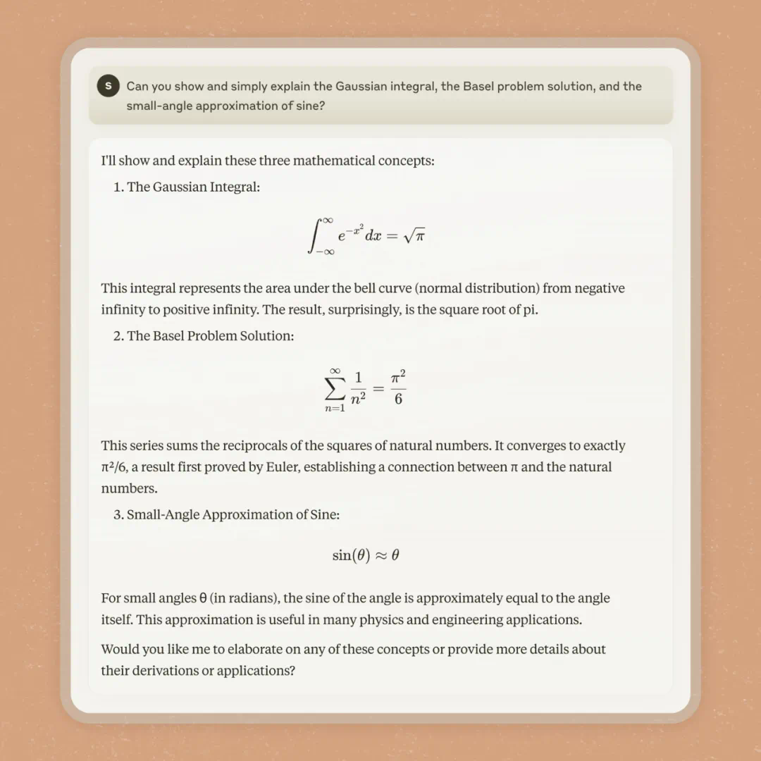 我们可以先看下面这个官方示例,「让 Claude 展示并简单地解释高斯积分、巴塞尔问题解和正弦的小角度近似。」