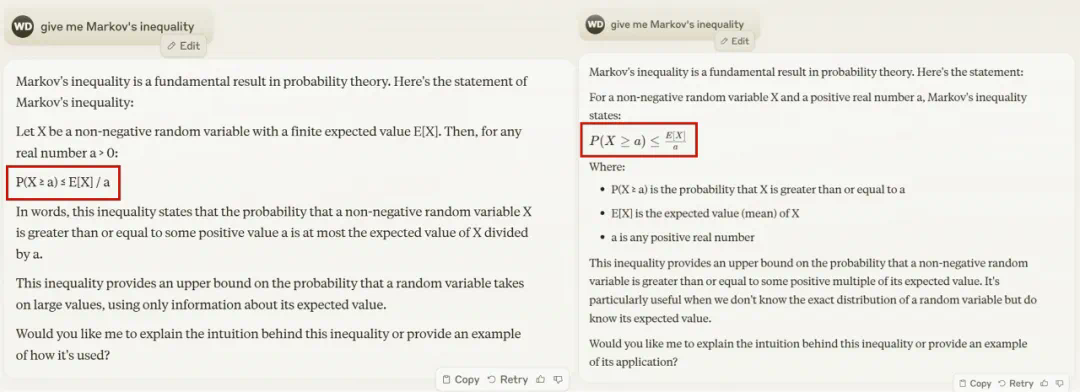 机器之心也试用了一下 Claude 3.5 Sonnet,下面为未开启 LaTeX(图左)与开启 LaTeX(图右)功能的方程式效果对比。