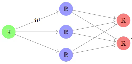 其中每个节点都是 ℝ 的一个副本,每个箭头都标记了一个权重 w,并且层之间的每个线性映射的结果都由一个非线性激活函数 𝑓 组成,然后再进入下一层。
