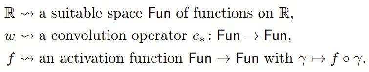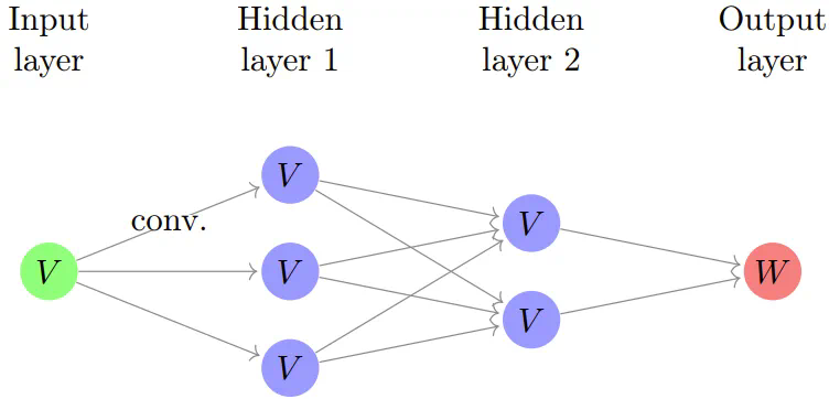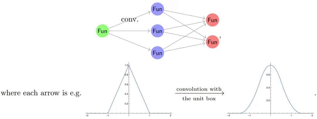 其中每个箭头都是一个卷积。此外,W 通常是 ℝ 或 V。上图是一张卷积神经网络的(经过简化的)图像,而该网络在机器学习领域具有重要地位。对于该网络的构建方式,值得注意的主要概念是: