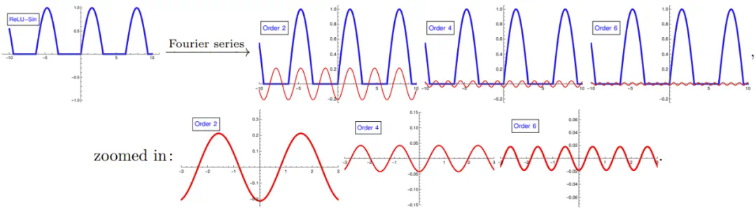 (这里展示了当 𝑓 是 ReLU 时,𝑓(sin (x)) 的前几个傅里叶级数项。)这与我们拨动吉他琴弦时发生的情况非常相似:一个音符具有与所弹奏音符相对应的基频,以及更高的频率(泛音,类似于上面底部的三张图片),它们结合在一起形成了吉他独特的音色。