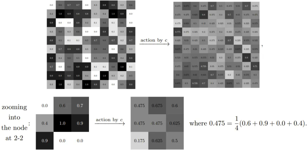 举个例子,如果令 c = 1/4 ((1, 0) + (0, 1) + (−1, 0) + (0, −1))。则 c・𝑓 是周期性图像且其像素 (a, b) 处的值是其相邻像素 (a+1, b)、(a, b+1)、(a−1, b) 和 (a, b−1) 的值的平均值。用图像表示即为:
